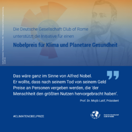 Die Deutsche Gesellschaft Club of Rome versteht sich als Visionär des Wandels. Für einen solchen gilt es auch, bisherige Denkmuster zu durchbrechen und neue Pfade zu erkunden. Deshalb unterstützen wir die Initiative für einen Nobelpreis für Klima und Planetare Gesundheit.